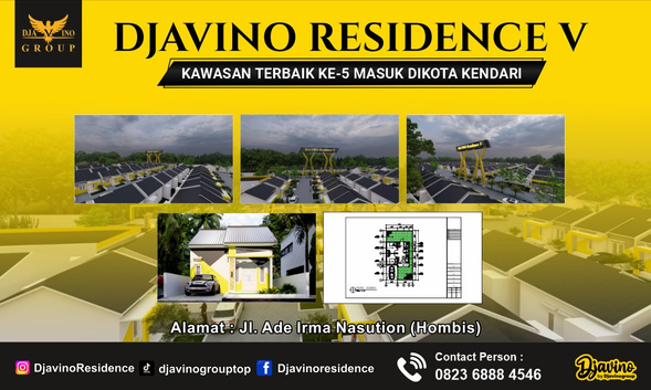 Menghadirkan Djavino Residence V, kawasan ke 5 sebuah perumahan dengan harga terjangkau yang dibangun di daerah berkembang di Kota Kendari. Hanya 25 menit dari bandara dan pintu gerbang 5 menit, 15 menit dari pusat kota dan mengusung konsep Compact House, kawasan ke 5 ini menjadi jawaban atas keterbatasan lahan dengan kebutuhan yang kompleks.